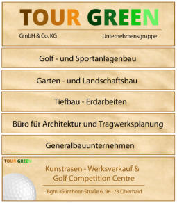 Tour Green ist im Bereich Golf- & Sportanlagenbau tätig. Mir der Erfahrung aus mehr als 30 Jahren können wir die bestmögliche Planung, Betreuung und Umsetzung Ihrer Projekte garantieren. Und darauf sind wir stolz. Unsere Ingenieure, Techniker und Meister haben durch eine Vielzahl von realisierten Kundenprojekten fundierte Kenntnisse, die sie gern auch bei Ihrem Vorhaben einsetzen. Die Kundenzufriedenheit steht bei uns an erster Stelle. Durch den gemeinsamen Dialog mit Ihnen erzielen wird das optimale Ergebnis. Basis hierfür ist auch unsere Preisbildung. So werden unsere bereit gestellten Leistungen zu den angebotenen Festpreisen pauschal ausgeführt. Egal ob Kurzplatz, Putting Green, Driving Range, Indoor-Golf oder „AdventureGolf“ bei uns sind Sie bestens aufgehoben! Im Bereich des Kunst und Logorasens sind wir zudem eines der größten Handelsunternehmer in Deutschland.